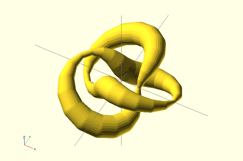 // Author: Tiago Charters de Azevedo // Maintainer: Tiago Charters de Azevedo // URL: http://diale.org/openscad.html // Version: 1 // Copyright (c) - 2014 Tiago Charters de Azevedo // This program is free software; you can redistribute it and/or modify // it under the terms of the GNU General Public License as published by // the Free Software Foundation; either version 3, or (at your option) // any later version. // This program is distributed in the hope that it will be useful, // but WITHOUT ANY WARRANTY; without even the implied warranty of // MERCHANTABILITY or FITNESS FOR A PARTICULAR PURPOSE. See the // GNU General Public License for more details. // You should have received a copy of the GNU General Public License // along with this program; if not, write to the Free Software // Foundation, Inc., 51 Franklin Street, Fifth Floor, // Boston, MA 02110-1301, USA. // Commentary: // Usage: see below. // Returns the i-the N linearly spaced elements between XMIN and XMAX. // The endpoints are always included in the range. function linspace(xmin,xmax,n,i)=xmin+i*(xmax-xmin)/n; // Converts from rads to degs. function deg(x)=180*x/3.141592653589793; // Point coordinates. // Examples: Trefoil knot function coordinates(t) = 10*[(2+cos(3*deg(t)))*cos(2*deg(t)), (2+cos(3*deg(t)))*sin(2*deg(t)), -sin(3*deg(t))]; function varradius(t) = 5; // Main module: // tmin = inicial parameter value // tmax = end parameter value // n = number of segments (sphere used) module curve(tmin=0,tmax=2*3.14,n=20){ for (i=[0:n-1]){ hull(){ translate(coordinates(linspace(tmin,tmax,n,i))){ sphere(r=varradius(linspace(tmin,tmax,n,i)));} translate(coordinates(linspace(tmin,tmax,n,i+1))){ sphere(r=varradius(linspace(tmin,tmax,n,i+1)));}}}} //-------------------------------------------------------------------------------- $fn = 10; curve(n=100);