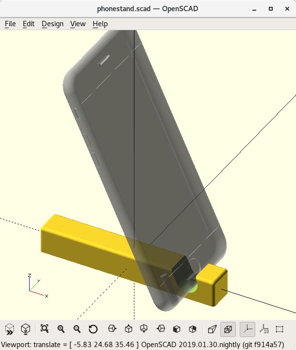 // Author: Tiago Charters // Maintainer: Tiago Charters // Copyright (c) - 2023 Tiago Charters de Azevedo (tiagocharters@nextp.pt) // This program is free software; you can redistribute it and/or modify // it under the terms of the GNU General Public License as published by // the Free Software Foundation; either version 3, or (at your option) // any later version. // This program is distributed in the hope that it will be useful, // but WITHOUT ANY WARRANTY; without even the implied warranty of // MERCHANTABILITY or FITNESS FOR A PARTICULAR PURPOSE. See the // GNU General Public License for more details. // You should have received a copy of the GNU General Public License // along with this program; if not, write to the Free Software // Foundation, Inc., 51 Franklin Street, Fifth Floor, // Boston, MA 02110-1301, USA. //////////////////////////////////////////////////////////// phi=1.618; b=20; h=10*phi; rc=.1*h; //////////////////////////////////////////////////////////// //cellphone dimensions (mm) //////////////////////////////////////////////////////////// l=160; c=2*50; d=40; hc=10; theta=20; //tilt angle a=l/2*cos(theta); module phonestand(){ difference(){ minkowski(){ cube([a-2*rc,b-2*rc,h-2*rc],center=true); sphere(rc,$fn=64);} // cellphone translate([a/2*cos(theta)-2*rc-hc/2,0,0]) rotate([0,-theta,0]) hull(){ translate([0,0,l]) rotate([90,0,0]) cylinder(h=50,r=hc/2,center=true); rotate([90,0,0]) cylinder(h=50,r=hc/2,center=true);} translate([0,0,-h+rc*(1-sqrt(2)/2)]) cube([a+1,a,h],center=true); translate([-b/2,0,0*h/2]) minkowski(){ cube([a/1.707-2*rc,b/2-2*rc,10*h-2*rc],center=true); sphere(rc,$fn=64);} } } phonestand();